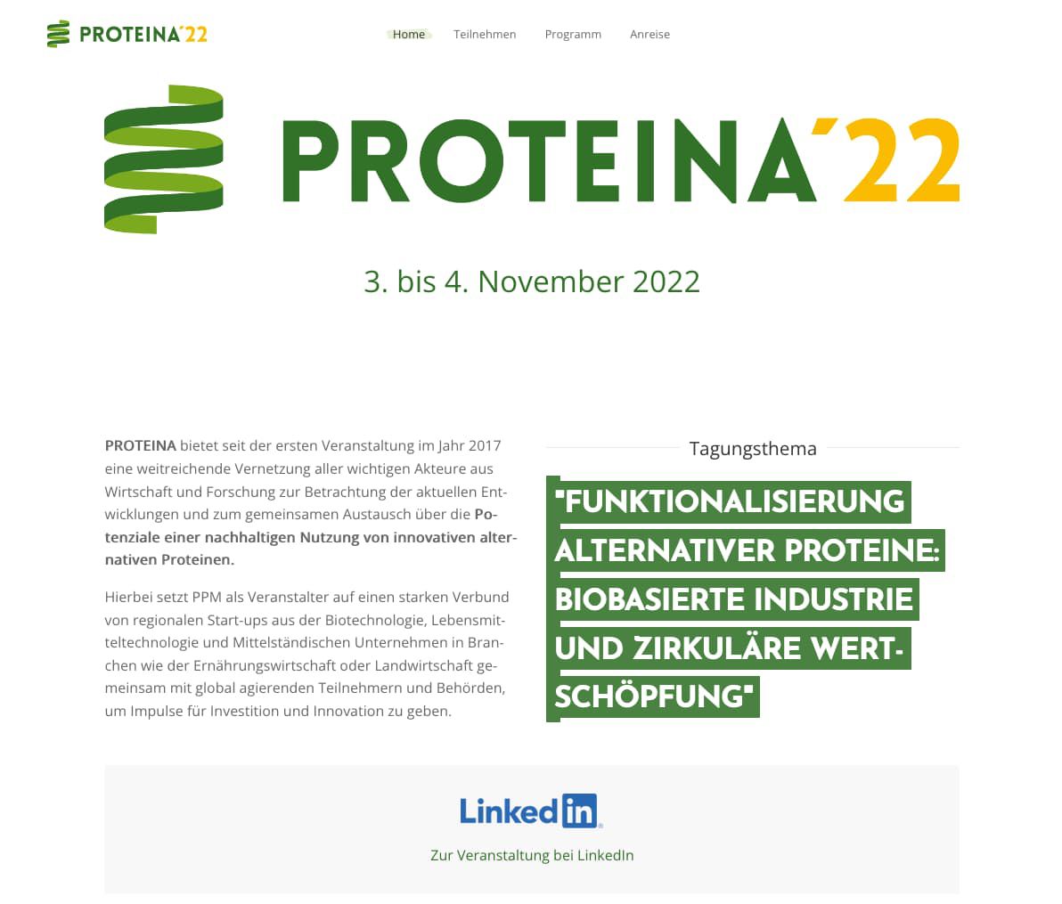 Ein voller Erfolg war die diesjährige Proteina-Konferenz zum Thema "Funktionalisierung alternativer Proteine: Biobasierte Industrie und zirkuläre Wertschöpfung", für die wir eine Website inkl. Anmeldeportal erstellten. Die Proteina-Konferenz wird jährlich vom Pilot Pflanzenöltech…