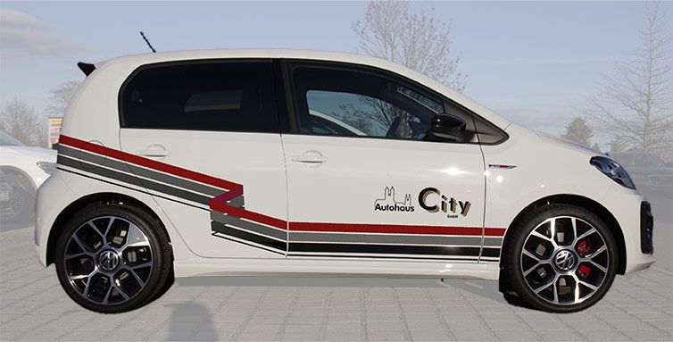 Neuer Look für 2 VW Up GTI Werkstatt-Ersatzfahrzeuge bei Autohaus-City! Unsere Entwürfe wurden von Liebke-Werbung gekonnt umgesetzt.