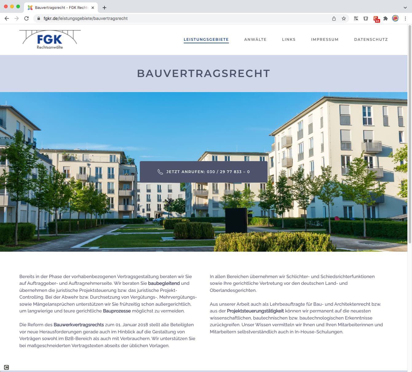 FGK Rechtsanwälte PartGmbB aus Berlin beauftragte uns mit der Erstellung einer neuen Webpräsenz. Die Kanzlei ist auf die Leistungsgebiete Architekten- und Ingenieurrecht, Bauvertragsrecht, Öffentliches Baurecht, Miet- und Wohnungseigentumsrecht, Vergaberecht und Bauträgerrecht spezialisiert…