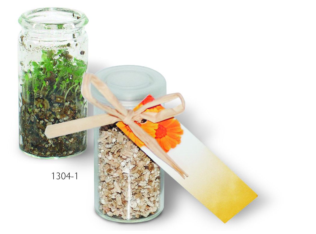 Ein Gewächshaus im Miniaturformat, das auch auf dem Schreibtisch oder auf der Fensterbank stehen kann. Im Gläschen ist bereits das Wachstumsgranulat mit den Samenkörnern enthalten. Auf der Anhängekarte ist die Anleitung bereits aufgedruckt. Auf der Vorderseite ist ausreichend Platz für Ihren Werbeeindruck. Auch eine eigene Gestaltung ist ab 250 Stück möglich.