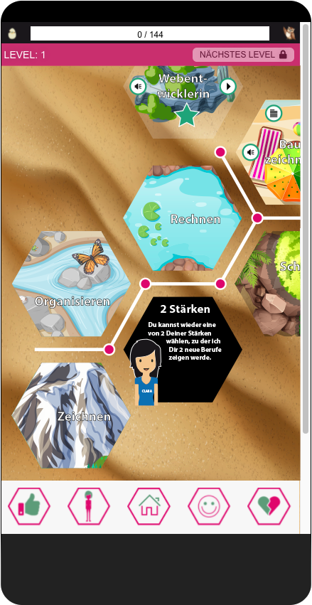 Der Avatar wird über eine hexagonale Berufelandkarte bewegt. Die selbst bewerteten Stärken und Wünsche helfen dabei, den passenden Einstieg in die Arbeitswelt zu finden. Interviews mit Rolemodels, Videos, Podcasts und andere digitale Elemente liefern komprimierte Informationen zu den einzelnen Berufen. Der Schwerpunkt des Projektes liegt auf den MINT-Berufen, also Berufen aus den Bereichen Mathematik, Informatik, Naturwissenschaft und Technik. Das Angebot ist besonders für Mädchen zwschen 14 und 17 Jahren geeignet.